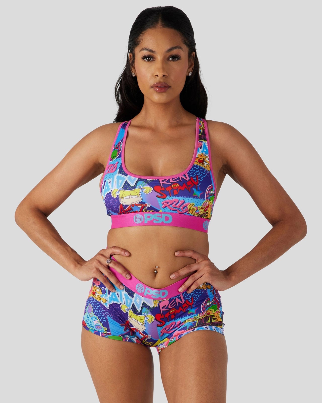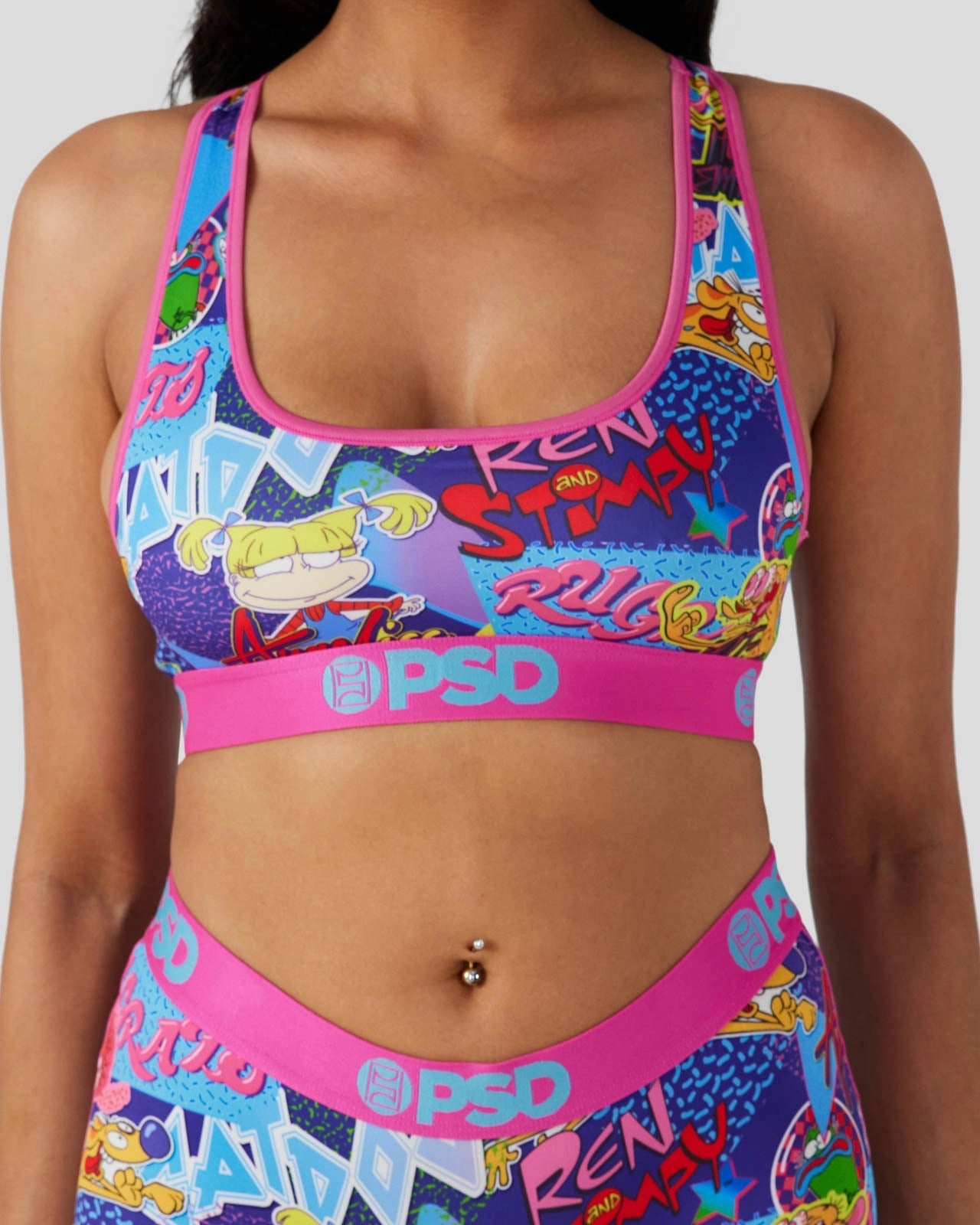 Bring back the good old days when cartoons were at their peak in this bra that features your favorite characters from Rugrats. CatDog. and Ren & Stimpy. Made from a silky poly blend. this the ’90s Miami Sports Bra is breathable yet slightly compressive. bringing you the comfort and support you need for everything you get into.