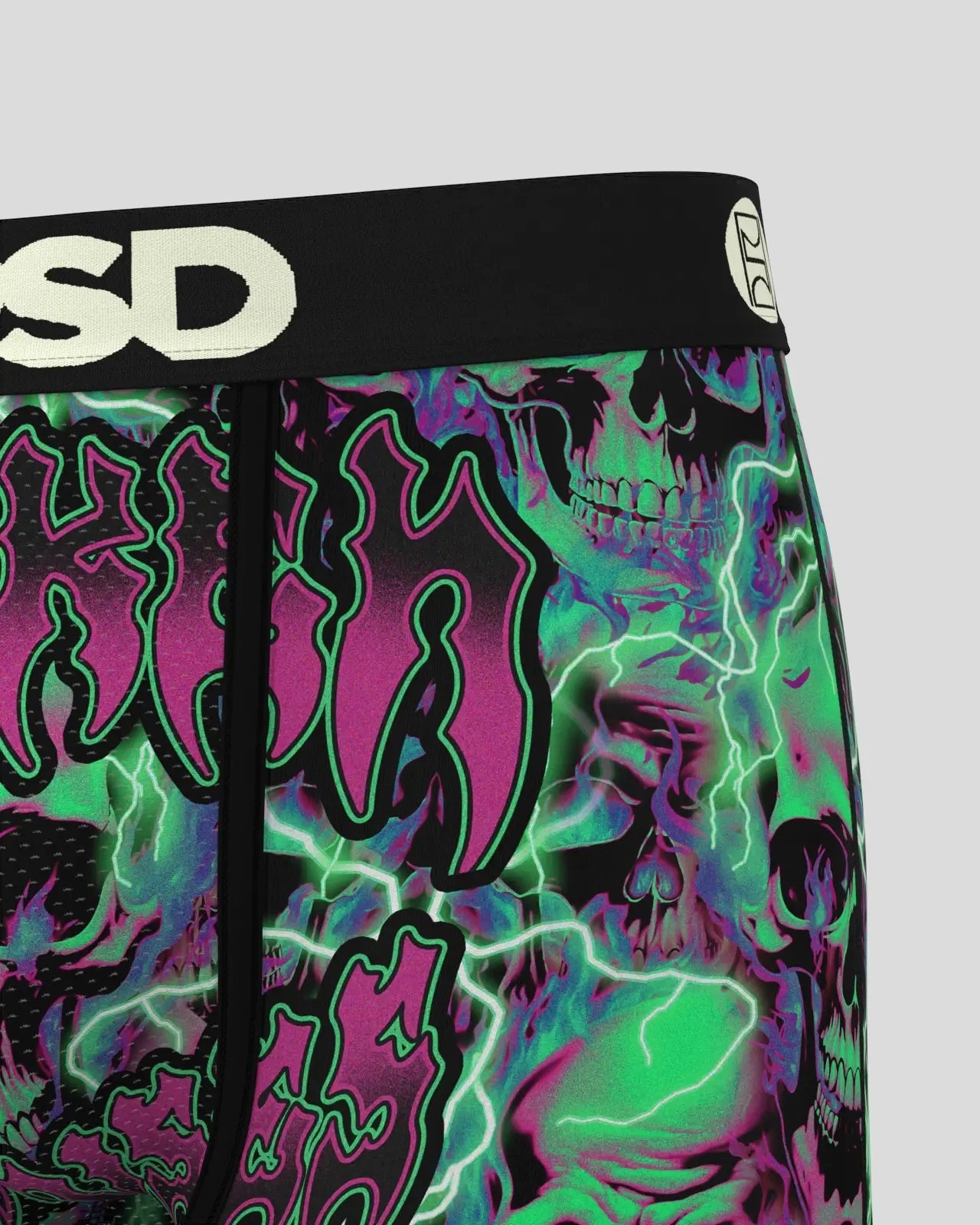 Our first collaboration with Broken Promises is here. Featuring a print inspired by their iconic graphics. the Skulls Glow briefs include our ultra-comfortable Signature WaistBand. a breathable MicroMesh pouch. and four-way stretch. The PSD 7 Standard Length Briefs won’t roll or ride and were built for everything. from everyday wear to your toughest workouts. Plus. this pair has a glow-in-the-dark waistband.
