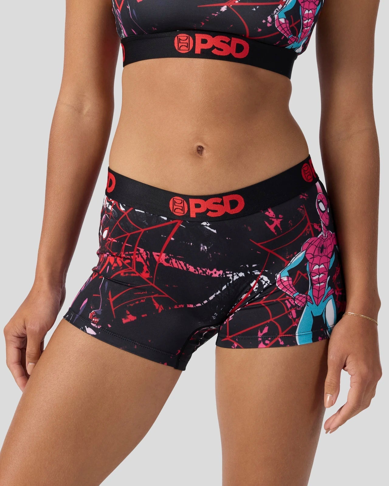 You’re not seeing double. Swing into new with this new Marvel pair featuring the spider duo. The Spider Bros Boy Short is made from a silky poly blend with a comfortable full coverage. keep-you-in fit. The PSD boy shorts are perfect for everyday wear and working out.