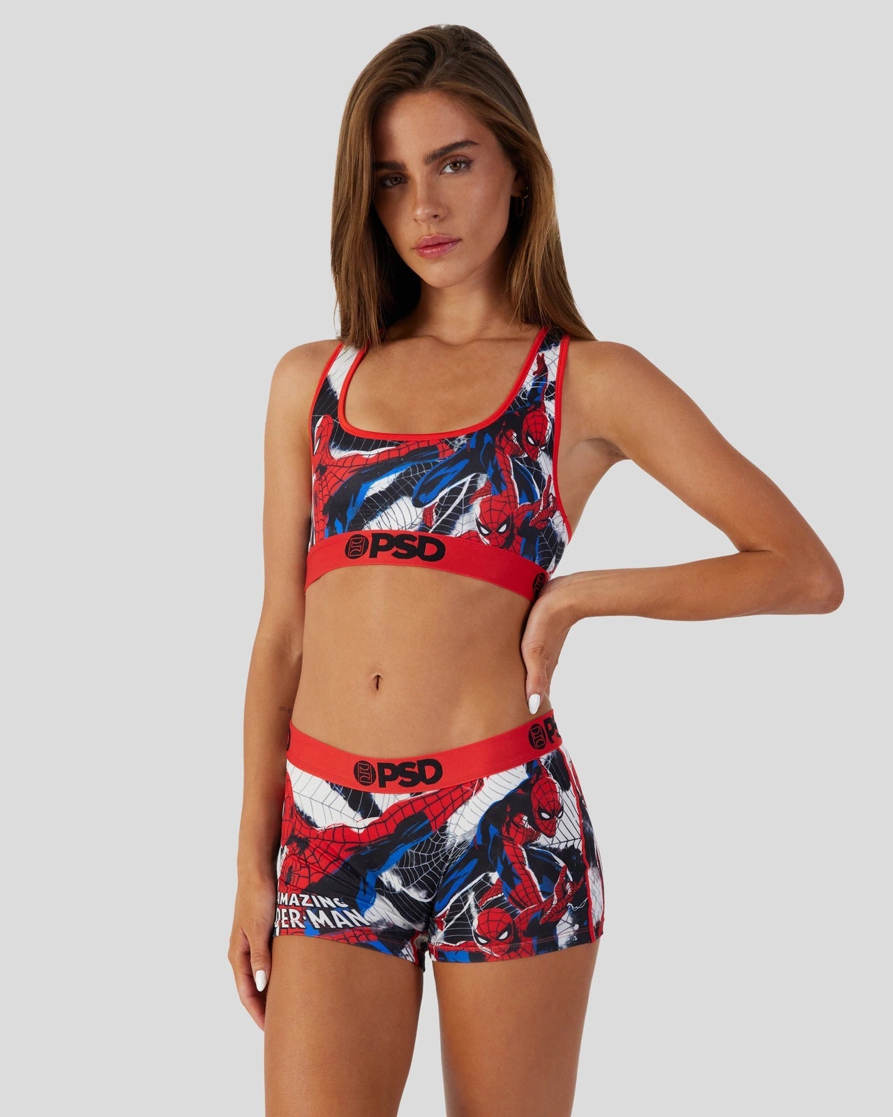 Spider-Man. also known as Peter Parker. is featured with much detail swinging into action across a tie-dye print on these sports bras. Made with our silky poly blend. the Spider-Man Bra is breathable yet slightly compressive. bringing you the touch of comfort and support you need for everything you get into. Whether you’re looking for unique gift ideas for someone or placing an online order for yourself. the Spider-Man Bra will have you prepared for any adventure.