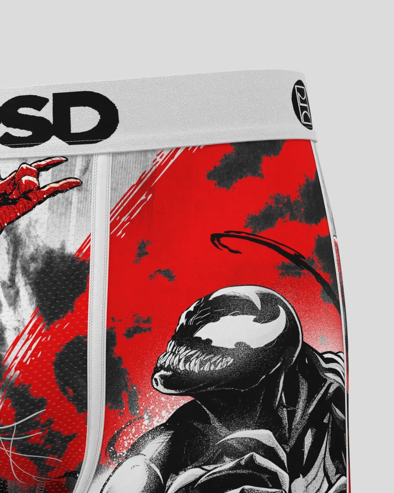 The rivalry returns with this new pair from Marvel featuring Spider-Man and Venom. The VS briefs include our ultra-comfortable Signature WaistBand. a breathable MicroMesh pouch. and four-way stretch. The PSD 7 Standard Length Briefs won’t roll or ride and were built for everything. from everyday wear to your toughest workouts.