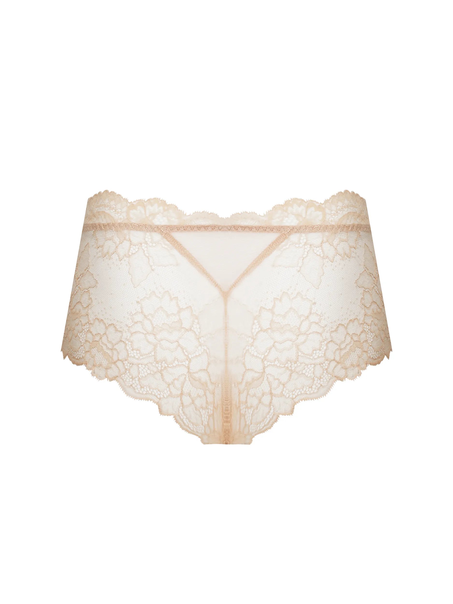 Low-waisted briefs modelled on man’s boxer shorts with a feminine twist.
